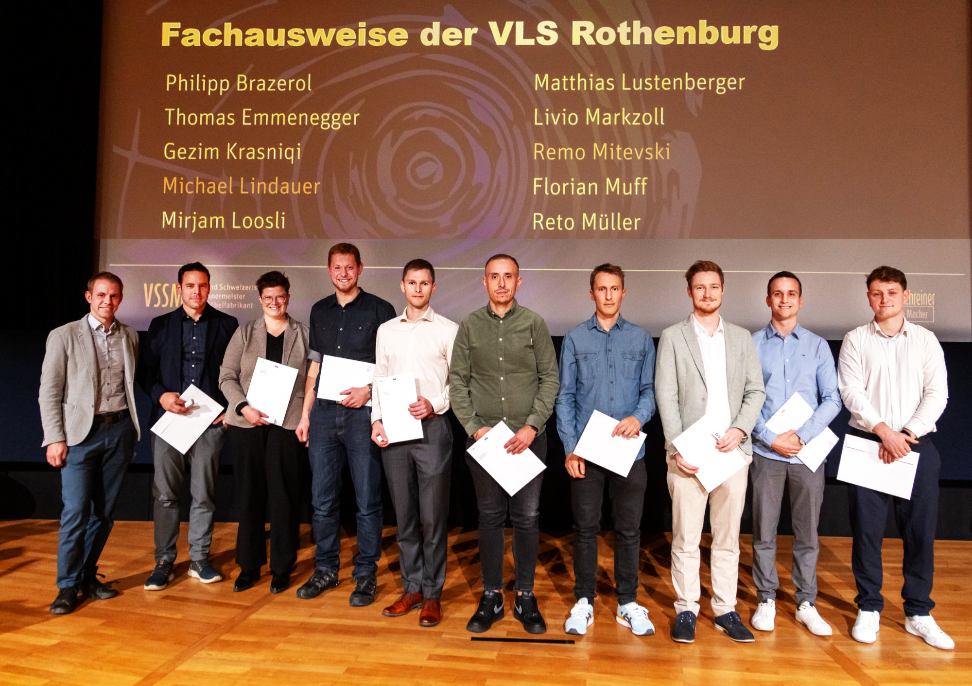 Der anspruchsvolle Bildungsweg startete mit der ersten Stufe: Über rund ein Jahr vertieften die Teilnehmenden ihre Kernkompetenzen in Projektarbeit, praktischer Fertigung, Ausbildung/Führung, Produktion und Evaluation. Nach dem erfolgreichen Abschluss als Fertigungsspezialist:in VSSM widmeten sich die Studierenden in den anschliessenden rund zwei Jahren weiterführenden betriebswirtschaftlichen Themen. Hier standen Organisation, Kalkulation und Planung im Zentrum, wodurch sie ihren Wissens- und Erfahrungsschatz wesentlich erweiterten. Alle 10 Diplomanden haben diese vielseitigen Herausforderungen im Qualifikationsverfahren mit Bravour gemeistert und tragen ab sofort den verdienten Titel Projekt- oder Produktionsleiter:in Schreinerei FA.